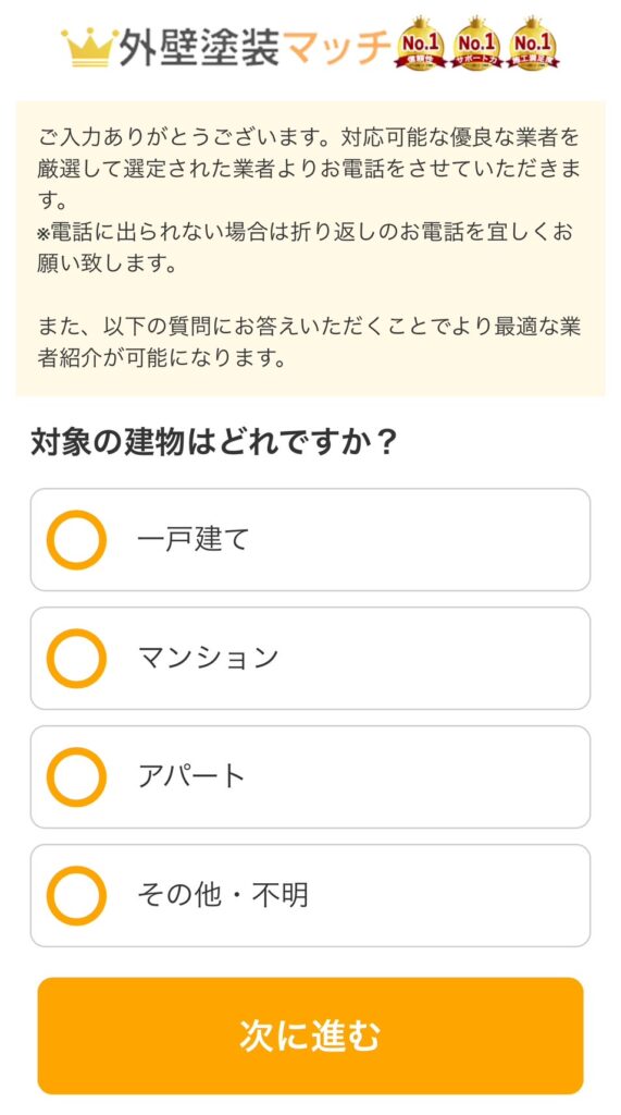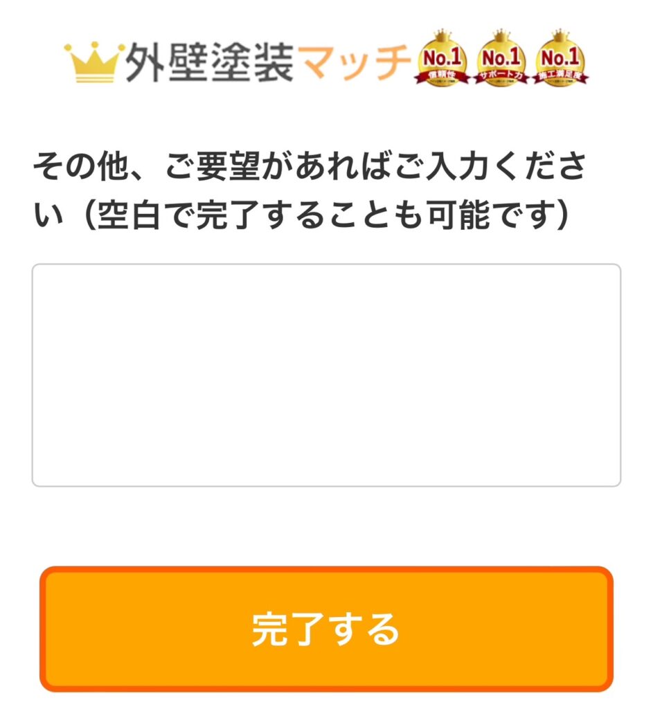 「完了する」を押すと、その時点で申し込み完了となって、外壁塗装マッチのオペレーターからすぐに電話が掛かってくるので、ちゃんと申し込むことを決めてからボタンを押して下さい。