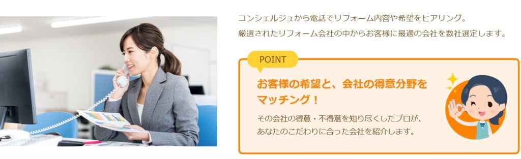 リフォームガイドでは、コンシェルジュが在籍しており、リフォームの疑問や不安に答えてくれます。ヒアリングをしっかり行ったうえで、最適な業者を選びや現地調査の日程も調査してくれるため、リフォーム初心者の方も利用しやすいです。