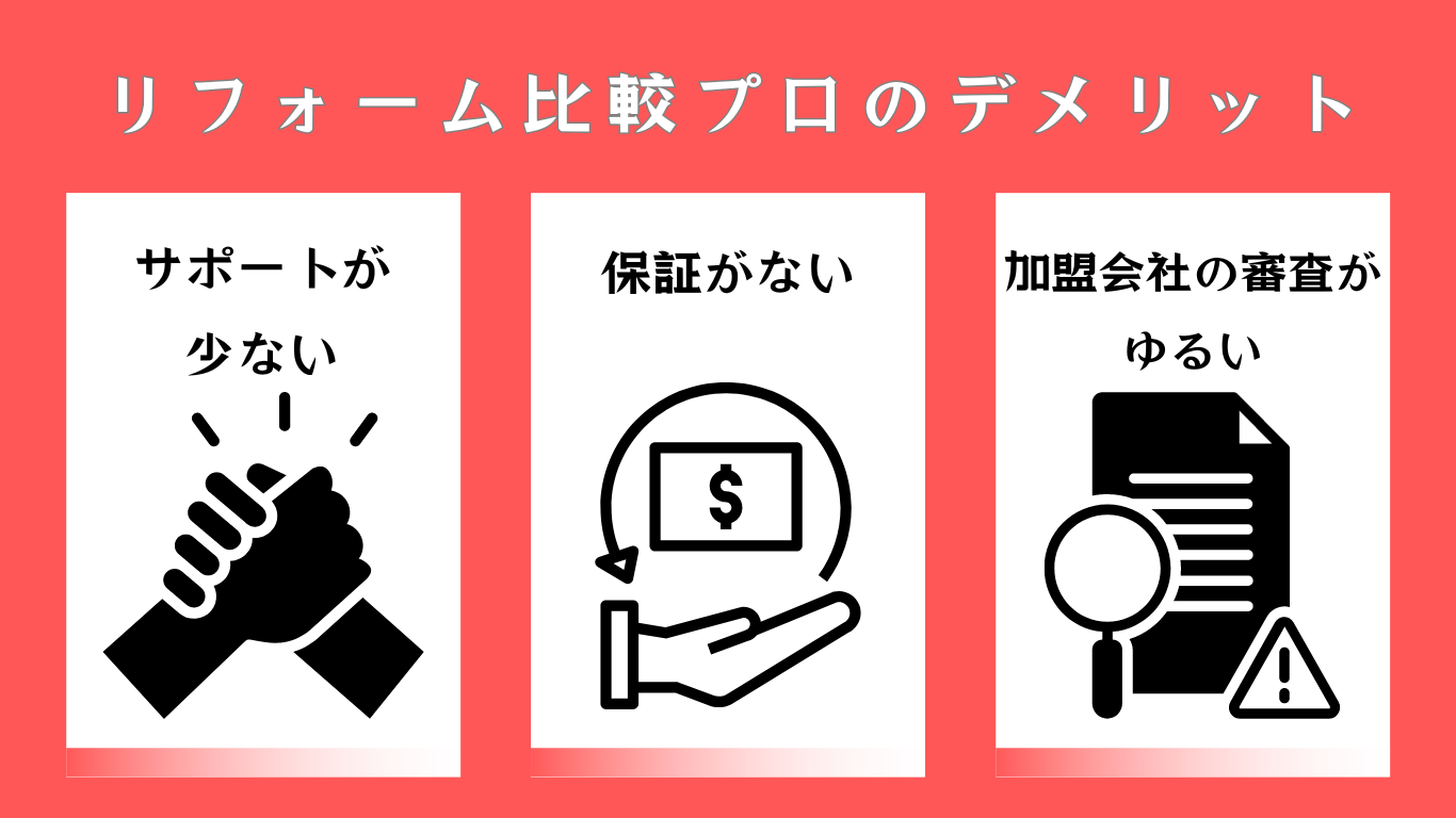 リフォーム比較プロは、紹介された会社との間にトラブルが発生した場合の保証が用意されていません。
