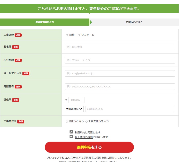 公式サイトのトップページの無料見積もりから入って「無料申込をする」を押すと、その時点で申し込み完了となってしまいます。そうすると、リショップナビエクステリアのオペレーターからすぐに電話が掛かってくるので、ちゃんと申し込むことを決めてからボタンを押して下さい。