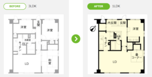 上記のプランは、内装や間取り変更だけでなく、古くなったお風呂、洗面、トイレなどの水回りも一新。間取りやサッシも、一部交換しています。